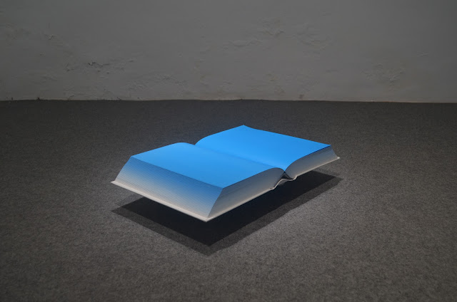 The work "C" is a book printed on stone paper. Among the 4-colors printing (CMYK), excluding black (K) as an auxiliary color, "Cyan" is the color that disappears the slowest after sunlight exposure. Thus "C" is the color that is closest to eternity. Just as the tides of the sea are caused by the moon; the fading of prints is due to the light of the sun, in these change, perhaps it is telling the memory of time.